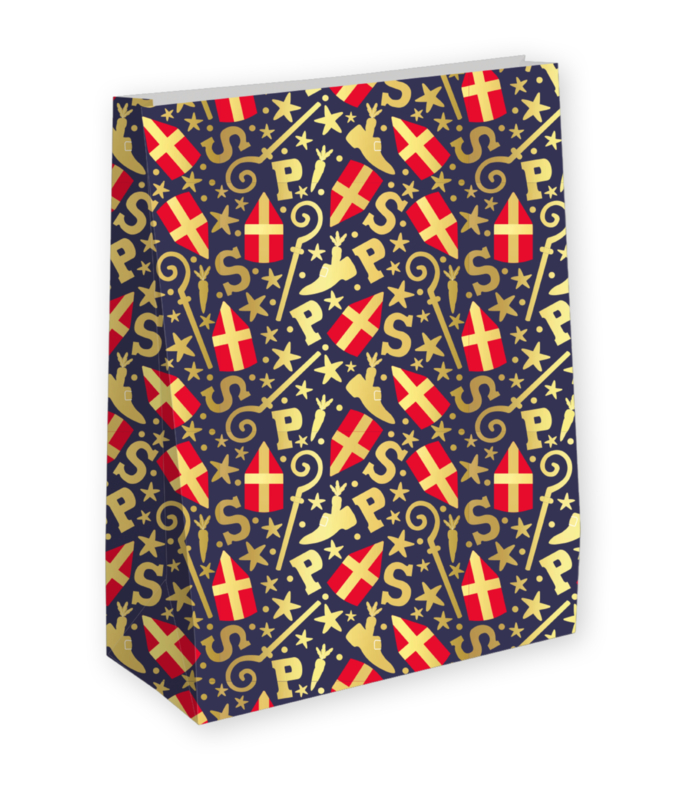 Deze ruime blokbodemzak is speciaal ontworpen voor grote cadeaus. Dankzij het stevige papier en het vrolijke dessin geef je ieder pakket een feestelijke uitstraling. Vul de zak met vloeipapier in Sinterklaaskleuren (rood, geel of goud) voor een extra luxe presentatie.