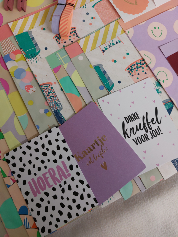 De papierklemmen en knijpers zorgen ervoor dat je verpakking netjes blijft zitten en geven een speels detail aan het geheel. Met de cadeaukaarten voeg je eenvoudig een persoonlijke boodschap toe, waardoor jouw cadeau nog specialer wordt.